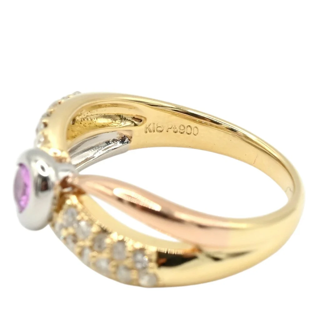 イエローゴールド、ピンクゴールド、プラチナ(Pt900)の3つの素材が、優雅な曲線を描きながら重なり合うデザインです。