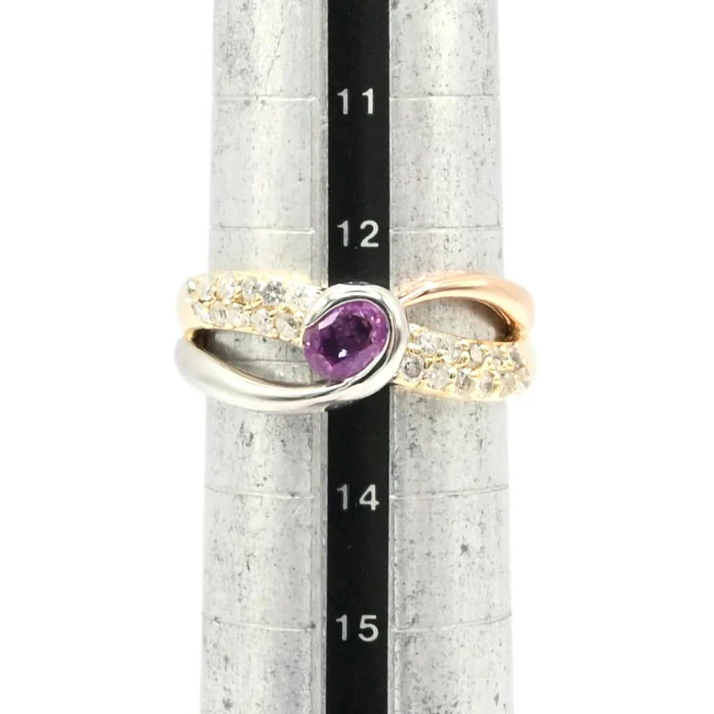 中央には、吸い込まれるような深みのあるパープル系の色石をセッティング。 周囲にあしらわれた計0.30ctのダイヤモンドが、メインストーンの鮮やかさをより一層引き立てます。流れるようなラインに沿って配置されたダイヤが、指を細く、長く見せてくれる効果も嬉しいポイントです。