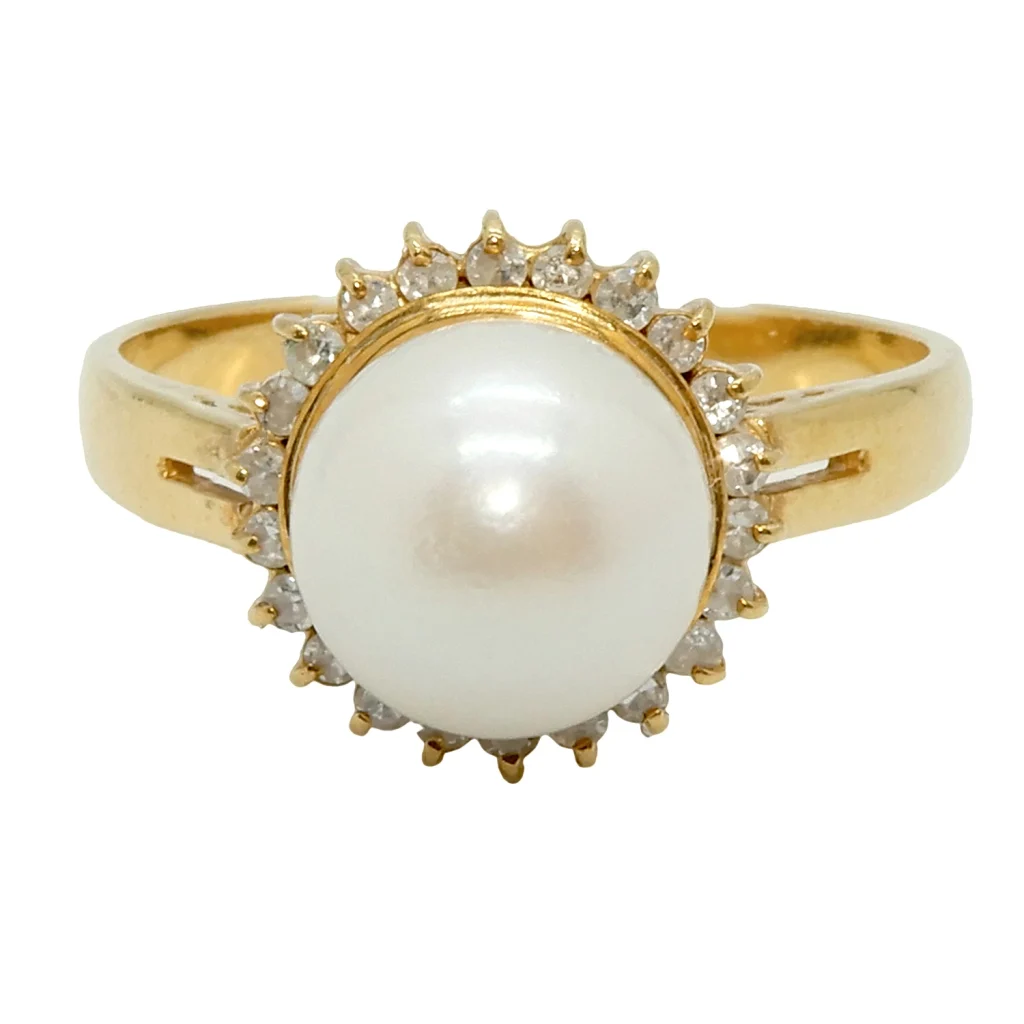 今回入荷したのは、大粒のパールを中央に配し、その周囲を0.17ctのダイヤモンドで取り巻いた贅沢なデザインのリングです。 地金には、日本人に肌馴染みの良いK18イエローゴールドが使用されており、パールの柔らかな光沢をより一層引き立てています。