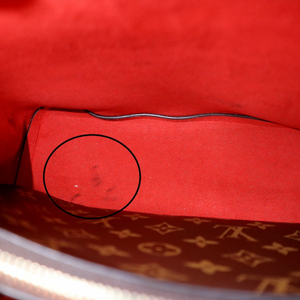 伝統的なモノグラムに、鮮やかなレッド(コクリコ)のドローストリングとライニングが映える