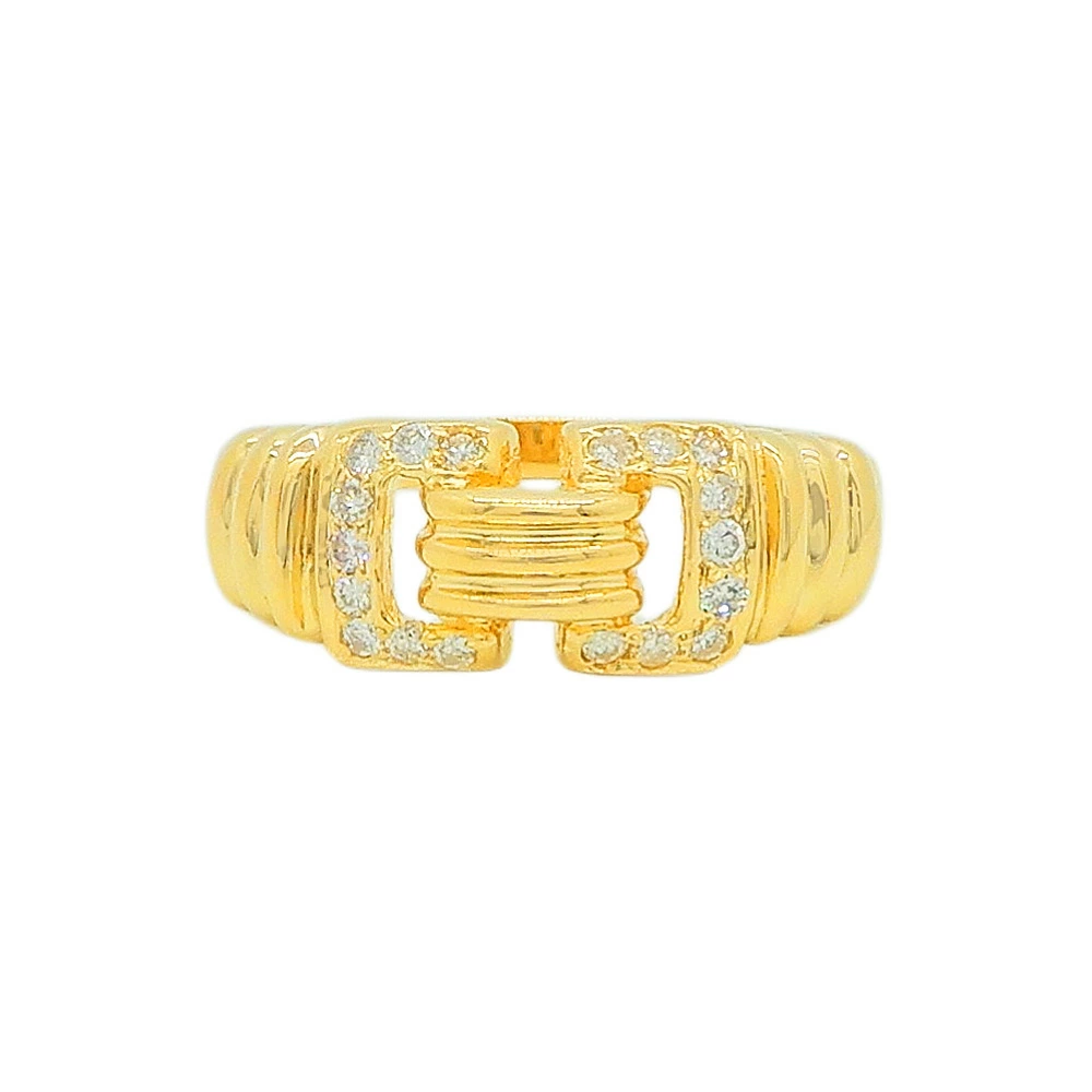 中央に配置されたダイヤモンドは、隙間なく敷き詰められた「パヴェセッティング」により、0.14ctという数字以上の輝きを放ちます。また、アーム部分から続く立体的なリブ(溝)のデザインが、ゴールドの光沢をより複雑に、美しく見せています。