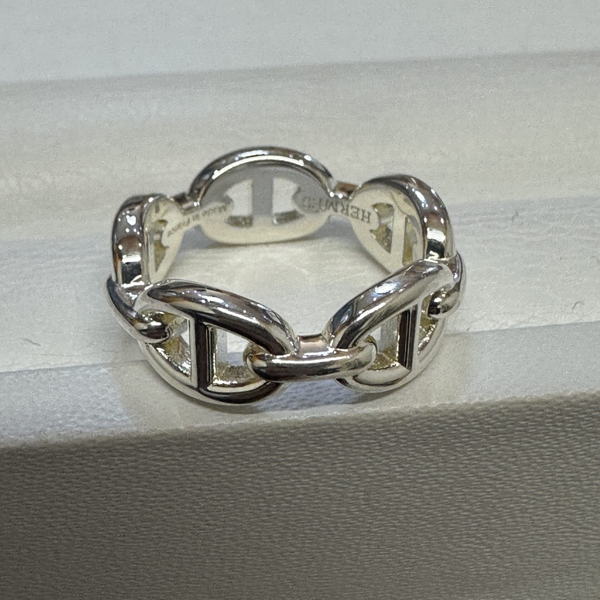 今回お買取りしたのは エルメス「シェーヌダンクル アンシェネ」Ag925 リング。エルメスを代表する“錨の鎖(アンカーチェーン)”モチーフを、リングとして再構築した人気モデルです。アンシェネ(=鎖でつながれた)という名の通り、シェーヌダンクル特有のコマが立体的に連なるデザインで、シルバー925ならではの深みのある輝きが手元を印象的に演出します。