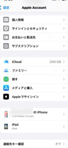 - ご自身のApple ID(一番上の名前の部分)をタップ。