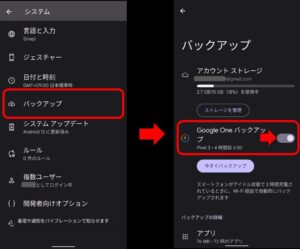 • ※自動バックアップを初めて使用する場合は、**「デバイスをGoogle Oneでバックアップ」**をオンにし、画面の指示に従って操作してください。