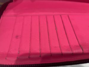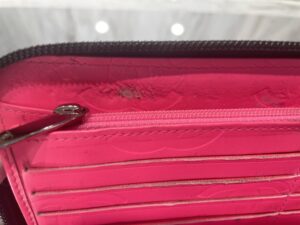 今回買取させていただいたシャネル カンボンライン 長財布は、シリアル番号から2015年に購入されたお品です。外観は丁寧にご使用されていたのがよく分かります。内側では、約9年ご使用された状態が分かるほど、使用頻度の高い部分にダメージがありました。札入れ、オープンポケット、カードポケットにスレが複数あります。