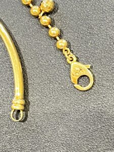 • 温泉や薬品、汗などによる変色やくすみがないかを確認します。K18は比較的変質しにくいですが、特に留め具の裏側などは汚れが溜まりやすい部分です。