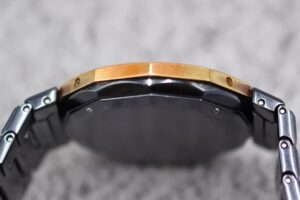 - 金部分(YG)の状態: ベゼルやリューズに使われているイエローゴールド部分に、変色や摩耗がないかを確認しました。金は柔らかいため、特に摩耗に注意します。