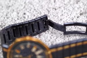 - ブレスレットの伸び: 長年の使用により、ブレスレットのコマ同士に隙間ができ、垂れ下がる(伸びる)現象がないかを確認します。今回は使用感はありましたが、極端な伸びは見られず、比較的良好な状態でした。