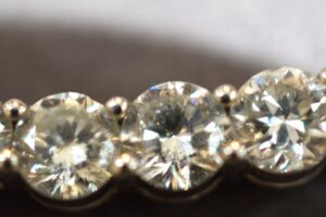 ダイヤの欠け: ラインネックレスは石同士が近いため、ぶつけた際の衝撃で石の角が欠けていないかをルーペで入念に確認します。