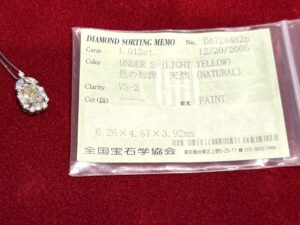「UNDER S(ライトイエロー)」という評価は、真っ白なダイヤではありませんが、1.012ctという圧倒的なボリュームと「VS-2」という高い透明度を兼ね備えており、ジュエリーとしての美しさは一級品です。相場の変動が激しい時期だからこそ、質屋かんてい局名古屋西店ではリアルタイムの最高値を反映し、お客様に納得いただける高価買取を実現いたしました。