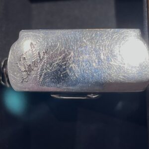 まずは、ウッドインレイ部分の状態を確認します。ウッドは天然素材のため、経年による「浮き」や、落下による「割れ」がないかが重要です。また、シルバー部分の傷の深さも精査します。今回の個体は、日常使用に伴う細かな擦れ傷が見受けられましたが、ウッドのコンディションが良好であったため、最大限の評価をさせていただきました。
