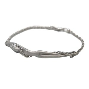 このブレスレットの最大の特徴は、中央に配された**「女神モチーフ」**です。ホワイトゴールドのクールな輝きの中に、女神の繊細な表情や流れるような髪のラインが立体的に表現されています。11.3gという程よい重量感があり、腕元で確かな存在感を放ちます。