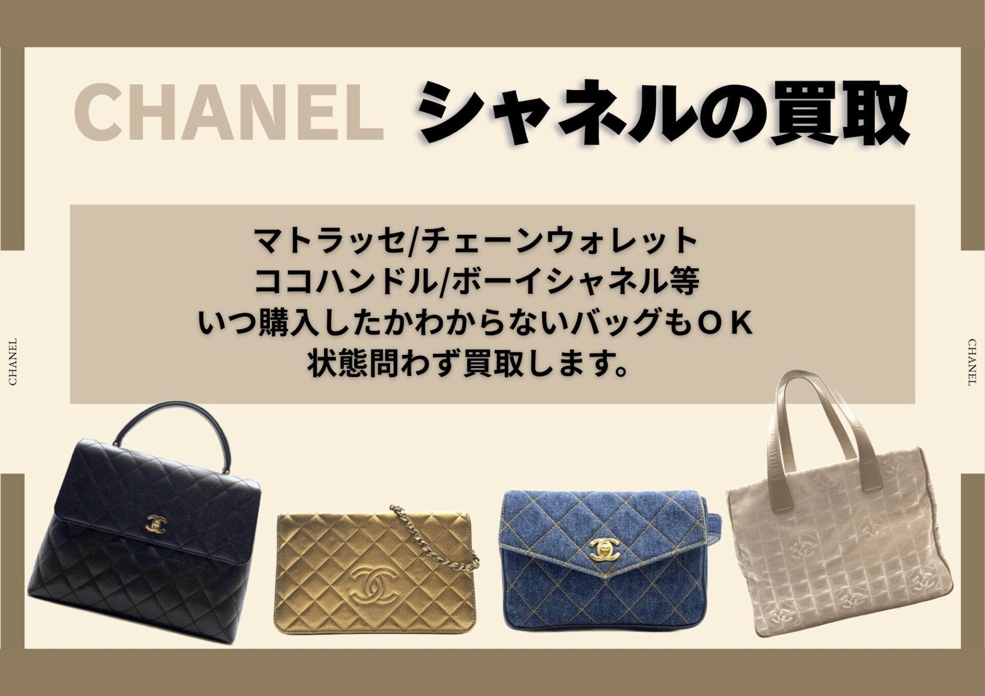 状態問わず、あなたのシャネルのバッグを「かんてい局名古屋栄錦三丁目店」が買取します。