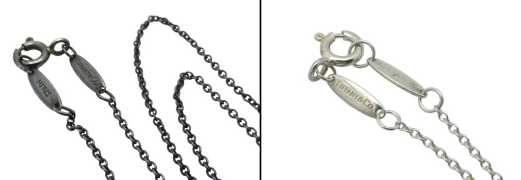 ティファニーのシルバーネックレスの場合、刻印は主に チェーンの留め具付近 に入っています。
