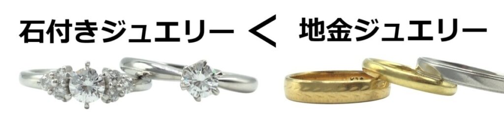 たとえば、色石や小粒のダイヤが沢山付いているデザイン場合、石の種類や品質によっては評価がつきにくく、逆に地金部分の重さや純度を正確に測ることができなくなってしまいます。