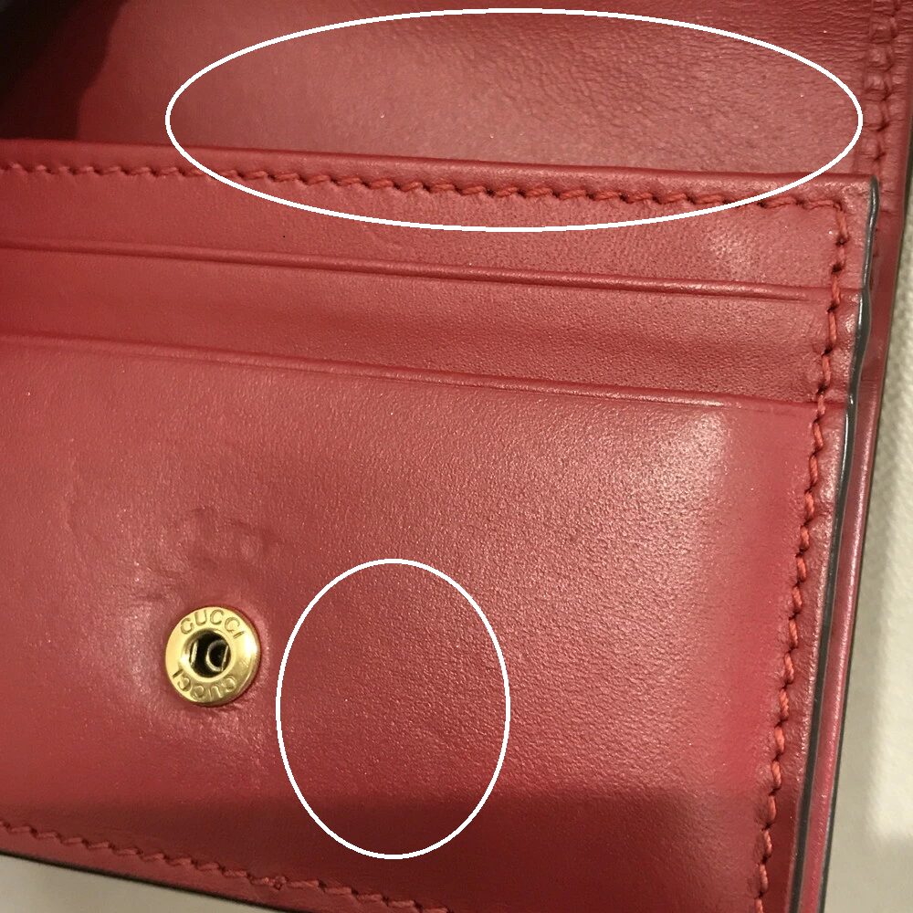 内側のレザーに押し跡やシワ、汚れなどの使用感が見られますね。