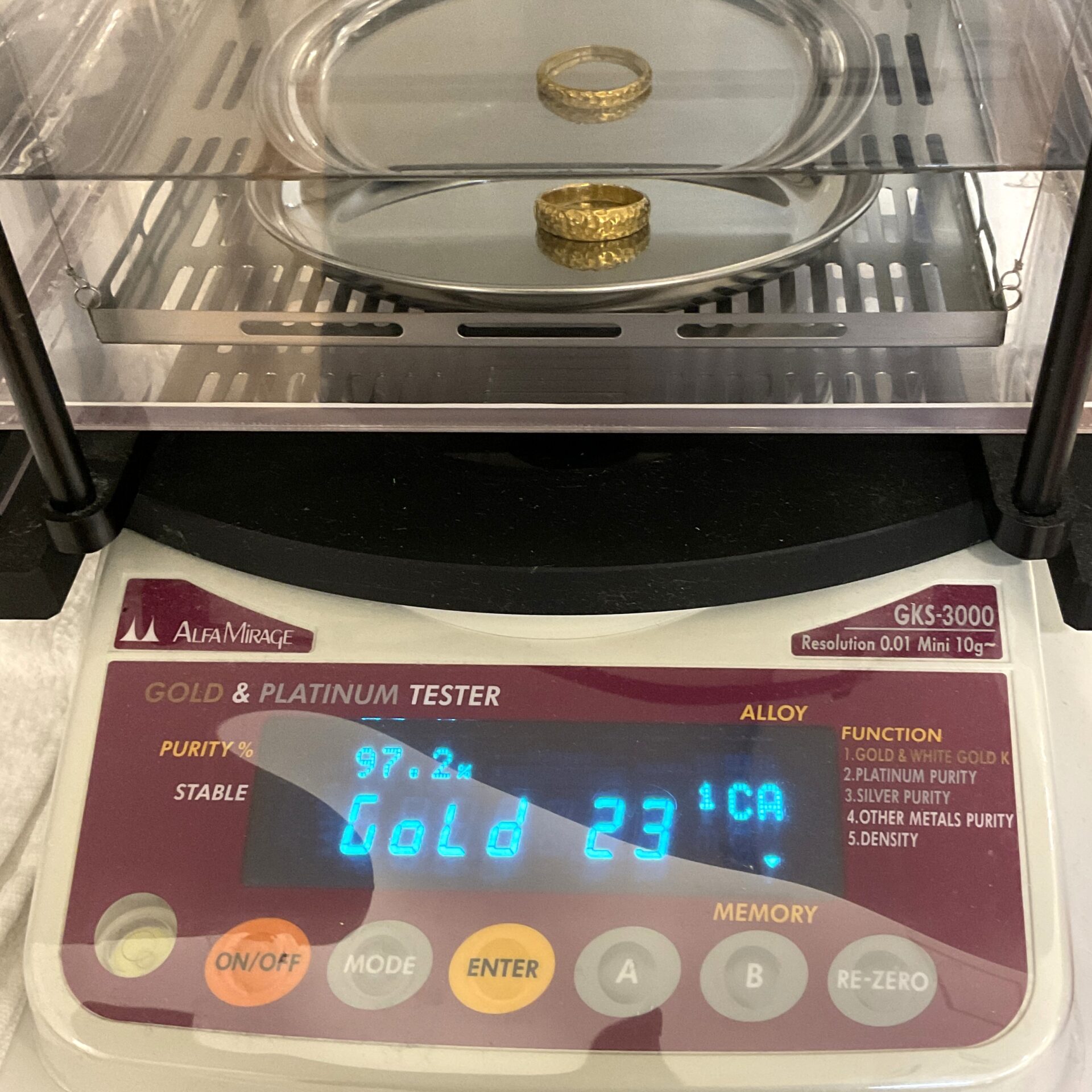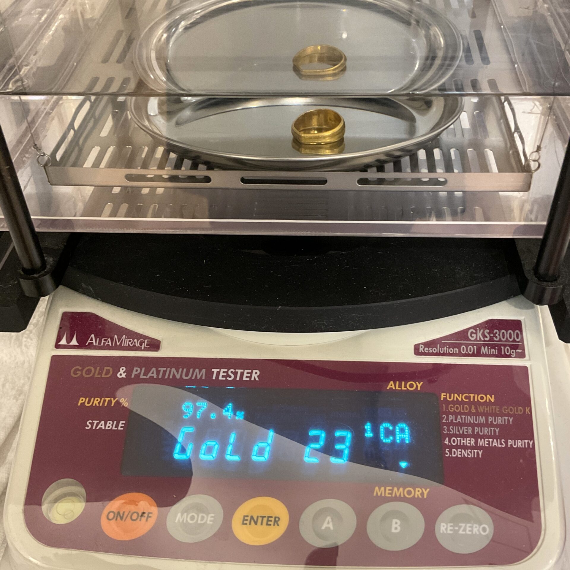 刻印を確認した後に、比重計でも金の純度を計りました。