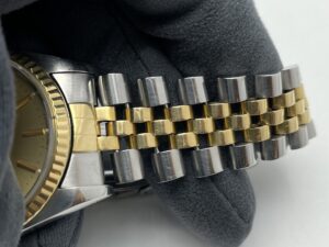 昔のデイトジャストはゴールドのコマの中が空洞になっており、素材の柔らかさも相まって徐々に伸びてきてしまうんですね。