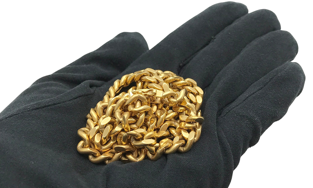 今回お持ち込みいただいたのは、手に取った瞬間にずっしりと重みを感じる、重量感のあるK18キヘイネックレスです。