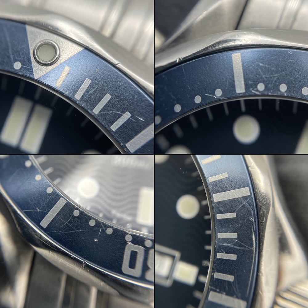 ダイバーズウォッチらしく日常の中で頼もしく使われてきた跡がそのまま残っている印象で、全体的に“使用感の強いベゼル”といえる状態でした。