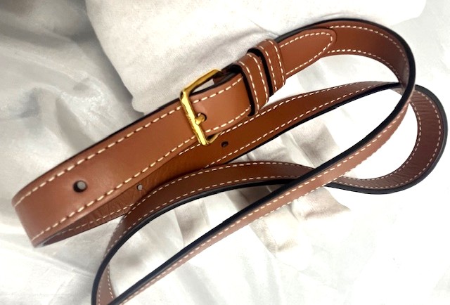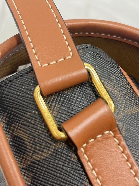 ショルダーストラップは、型崩れや毛羽立ちもなく、レザー部分の劣化やコバ割れも見られない良好な状態です。長さ調整部分の金具にも使用感はほとんどありません。