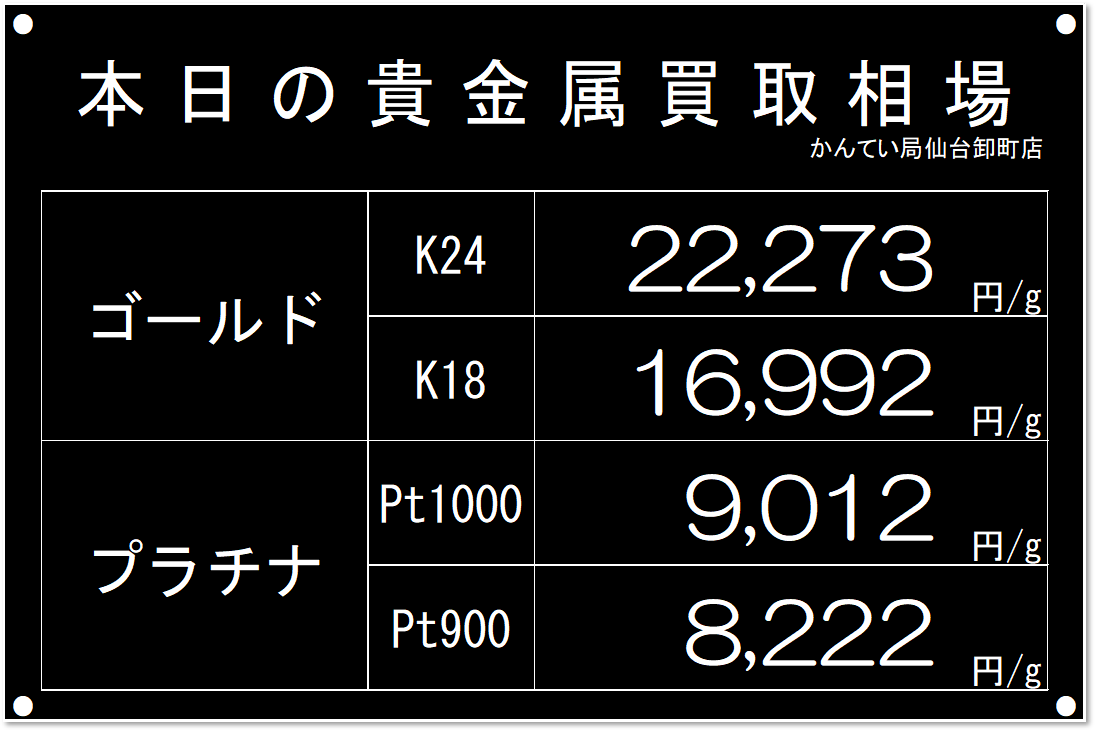 質屋かんてい局仙台卸町店の本日の金プラチナ買取相場です。