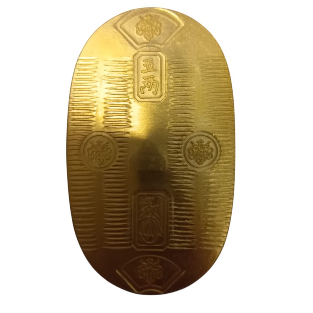 今回のお買取品紹介はいつぞやの物と同種の純金製の小判……いえ、中判です。中判についてのザックリ解説は前回の記事にありますので、興味がおありでしたらそちらをご参照ください。