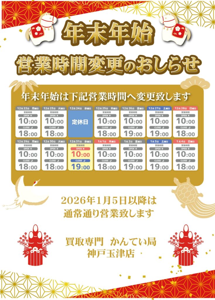 2025/12/29 年末年始営業時間のお知らせ 買取専門かんてい局 神戸玉津店は、年末年始も下記の通り営業いたします。 【営業時間】・12月28日(日)〜12/31(水)10:00〜18:00・1月1日(木)10:00〜18:00・1月2日(金)・1/3(土)10:00〜19:00・1月4日(日)10:00〜18:00 ※1月5日以降は通常営業となります。 年末年始のご不要品整理・買取のご相談は、ぜひ当店までお気軽にお持ち込みください。