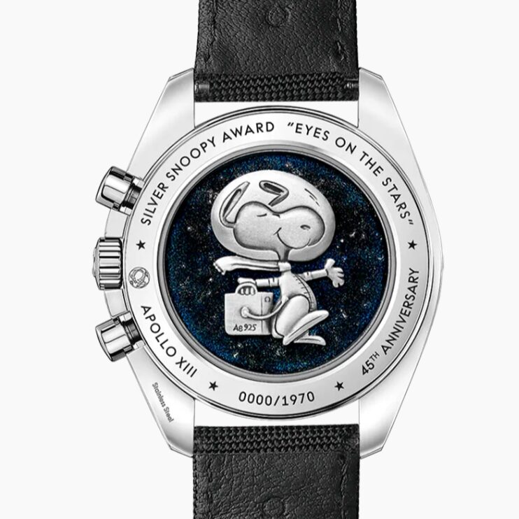 裏蓋にはエナメルで描かれたシルバーのスヌーピーがデザインされ、実際の「シルバー・スヌーピー・アワード」メダルと同じ意匠が再現されています。