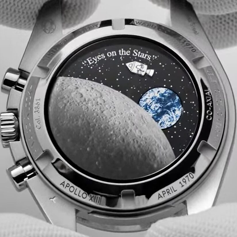 裏蓋には「Eyes on the Stars(星を見つめて)」の文字とともに、スヌーピーが月へ飛んでいくアニメーションギミックが搭載されています。クロノグラフを作動させると、司令船に乗ったスヌーピーが月軌道を進み、地球をかたどったディスクが1分に1回転するという遊び心あふれる仕掛けです。