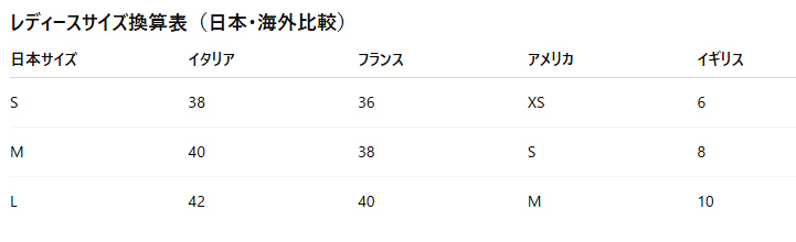 国別 ブランド服サイズ早見表(目安)