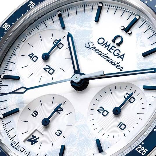 冬の情景を思わせるデザインとして、ホワイトラッカーダイヤルには淡いブルーのフロスト加工を重ね、まるで指先で描いたかのような軌跡をあしらっています。このラインは、ミラノ・コルティナ2026のエンブレムに象徴的に描かれた「2」をモチーフにしたものです。