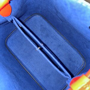 今回のお品は ブラックをベースに持ち手は紫、巾着紐は赤、ショルダーストラップは黄色 のマルチカラー仕様で、個性的なデザインが特徴です。