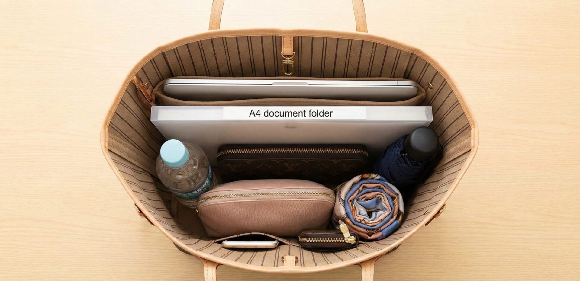 収納例:A4ファイル、13インチノートPC、タブレット、長財布、化粧ポーチ、500mlペットボトル、折りたたみ傘