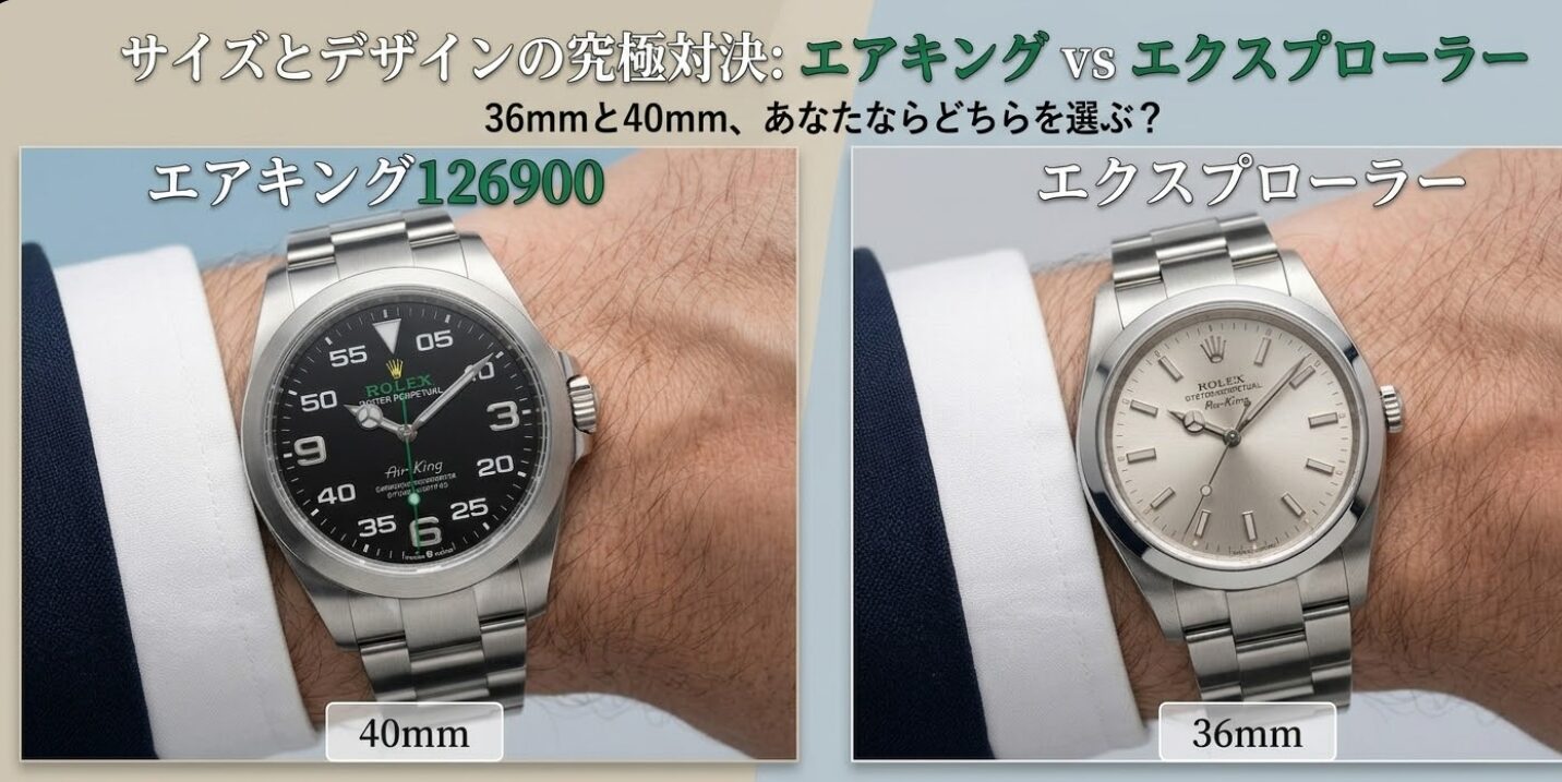 ロレックスの「エアキング(Ref.126900)」と「エクスプローラー(Ref.124270 / Ref.224270)」について、スペック、デザイン、サイズ感、資産価値の観点から徹底比較しました。