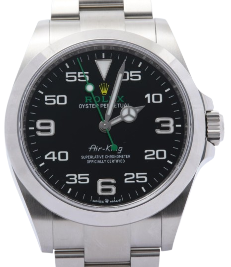 エアキング(Ref.126900)は2022年に発表された現行モデルです。前世代(Ref.116900)からリューズガードが追加され、よりスポーティかつ堅牢な外観へと進化しました。文字盤には「05」刻みの分目盛り(ミニッツスケール)が刻まれ、緑のロゴと黄色の秒針という独自の配色が際立ちます。
