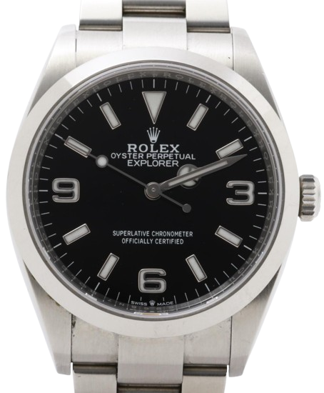 エクスプローラーは、1953年にエドモンド・ヒラリー卿のエベレスト初登頂に際して誕生した伝説的モデルです。現行の36mm(Ref.124270)は2021年に、40mm(Ref.224270)は2023年に発表されました。3・6・9のアラビア数字とバーインデックスのみというミニマルなデザインは、70年以上にわたってほぼ変わらない完成形です。