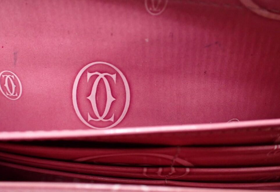 この財布の最大の特徴は上品な光沢を放つパテントレザーに、カルティエのロゴである2Cがモノグラムのように全面に型押しされている点です。特に、ブランドのシンボルカラーである深みのあるボルドーは、宝石のような輝きと気品を兼ね備えた定番色として高い人気を誇ります。
