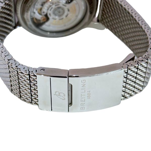 光沢のあるブラックダイヤルとポリッシュ仕上げのステンレススチールケースが、ブライトリング特有の高級感を演出します。