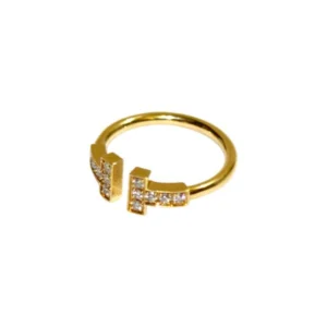 柔らかな輝きを持つイエローゴールドのアームは、指に沿うようにしなやかにカーブし、ラインの先端に配された“T”のフォルムが、シンプルでありながら強い存在感を放ちます。